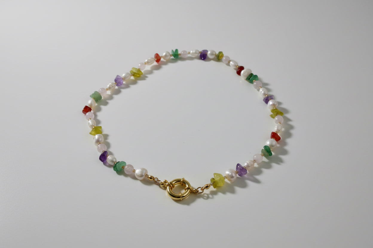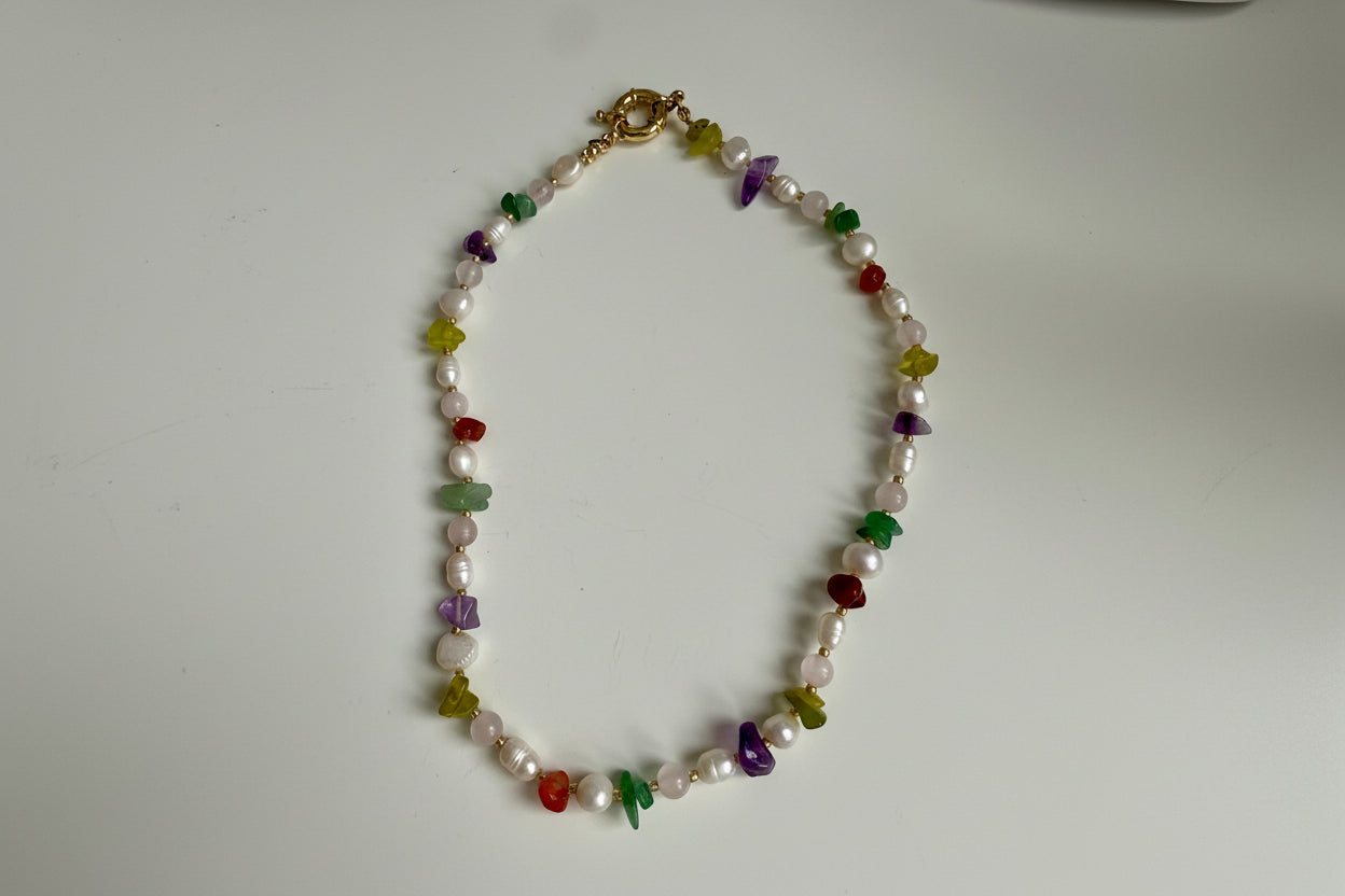 Die Konfetti Kette ist wie ein Sommertag zum Anziehen. Zarte Süßwasserperlen treffen auf ausgewählte Natursteinperlen in harmonischen Farben – lebendig, verspielt und trotzdem elegant.