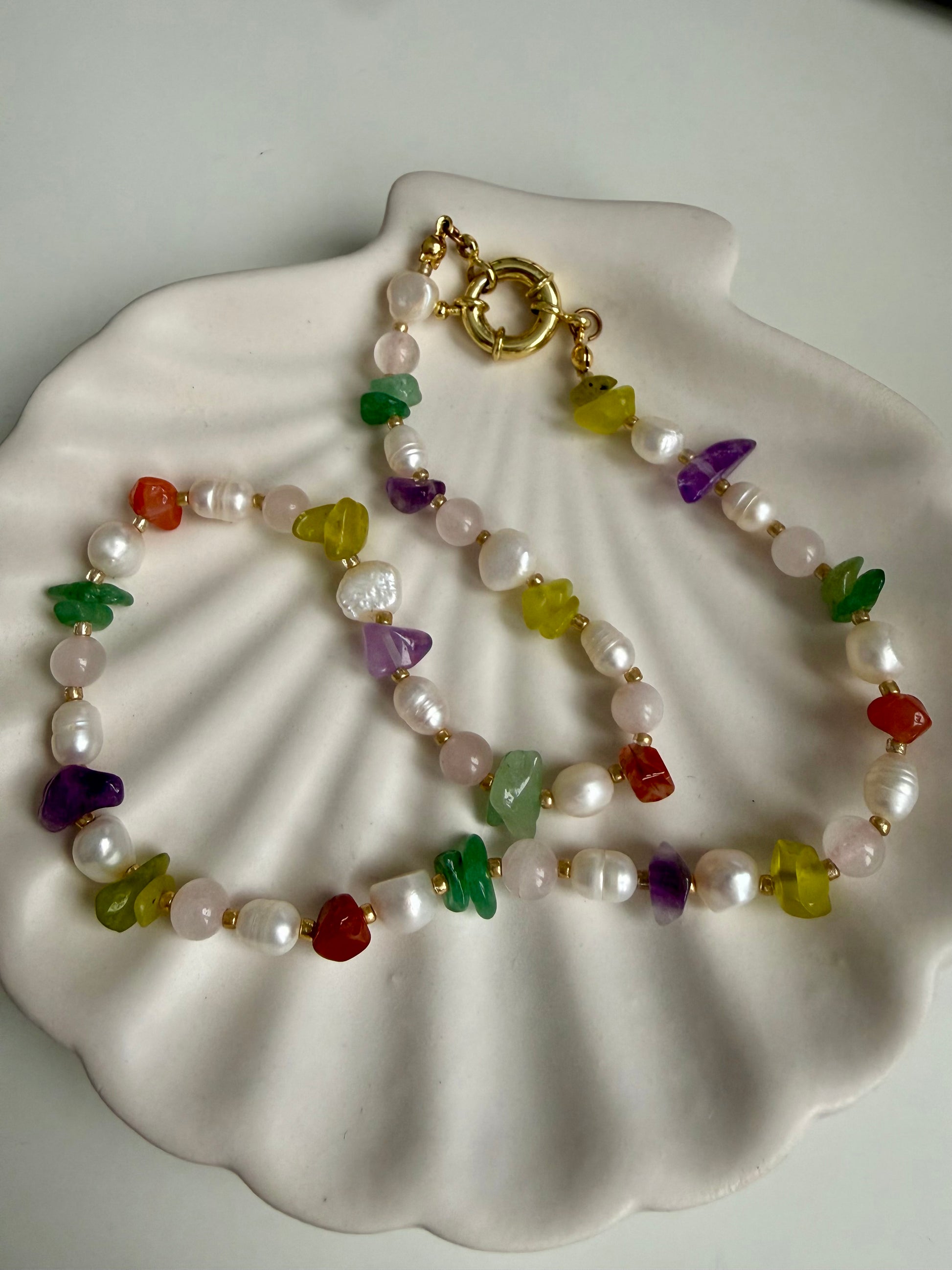 Jede Kette wird von Hand gefertigt und ist ein echtes Unikat. Die unterschiedlichen Farben und Formen der Natursteine machen jedes Stück besonders und sorgen für diesen kleinen Konfetti-Moment im Alltag 💛